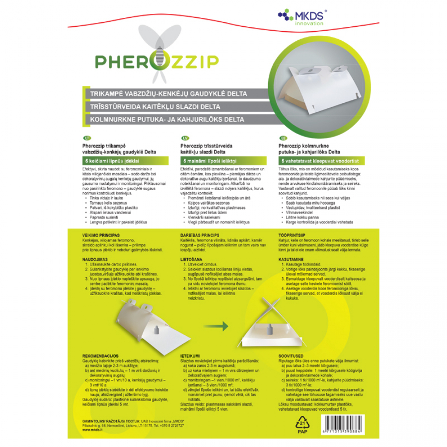 - Kahjur, kelle on feromoon kohale meelitanud, tiirleb selle ümber kuni väsimuseni, jääb kleepuva vooderdise külge kinni ja tal ei ole enam võimalust sealt välja lennata.